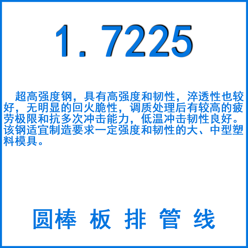 1.7225鋼材,此鋼擁有良好的加工性,加工變形微小,抗疲勞性能相當好,屬中等等淬透性鋼,1.7225熱處理后有較好的強度和良好的綜合力學性能,工藝性好,成材率高.最高使用溫度為427攝氏度.1.7225強度、淬透性高,韌性好,淬火時變形小,高溫時有高的蠕變強度和持久強度。用于制造要求較35CrMo鋼強度更高和調質截面更大的鍛件,如機車牽引用的大齒輪、增壓器傳動齒輪、后軸、受載荷極大的連桿及彈簧夾,也可用于 2000m以下石油深井鉆桿接頭與打撈工具,并且可以用于折彎機的模具等。