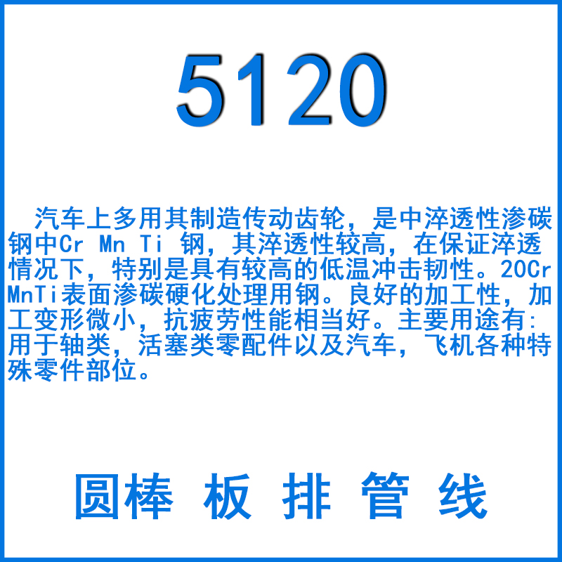 5120滲碳鋼,滲碳鋼通常為含碳量為0.17%-0.24%的低碳鋼。汽車上多用其制造傳動齒輪,是中淬透性滲碳鋼中Cr Mn Ti 鋼,其淬透性較高,在保證淬透情況下,特別是具有較高的低溫沖擊韌性。5120表面滲碳硬化處理用鋼。良好的加工性,加工變形微小,抗疲勞性能相當好。主要用途有:用于軸類,活塞類零配件以及汽車,飛機各種特殊零件部位。