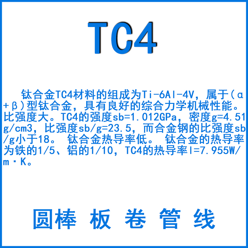 TC4鈦合金的組成為Ti-6Al-4V,屬于(α+β)型鈦合金,具有良好的綜合力學機械性能。比強度大。TC4的強度sb=1.012GPa,密度g=4.51g/cm3,比強度sb/g=23.5,而合金鋼的比強度sb/g小于18。 鈦合金熱導率低。 鈦合金的熱導率為鐵的1/5、鋁的1/10,TC4的熱導率l=7.955W/m·K。