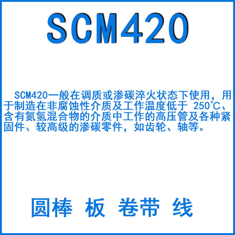 SCM420一般在調質或滲碳淬火狀態下使用,用于制造在非腐蝕性介質及工作溫度低于 250℃、含有氮氫混合物的介質中工作的高壓管及各種緊固件、較高級的滲碳零件,如齒輪、軸等。圖片關鍵詞●化學成份(單位%):